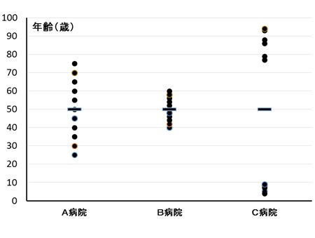 平均50歳ですというひと言で各病院の特性を説明するのが難しければ、各病院の患者の分布のばらつきを説明すればよいのです。
