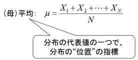 平均(母平均)とは、分布の代表値の一つで、いってみれば分布の「位置」の指標です。