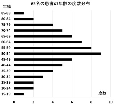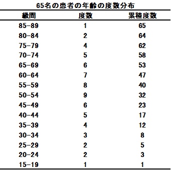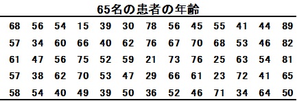 では次に、ある病院の65名の患者の年齢が以下のような分布をしていたとしましょう。