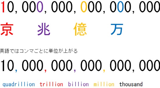 ただ、桁数が多い数を日本語で読もうとすると、どうもこの3桁ずつの区切りが邪魔になります。