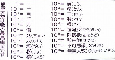 日本で一般的に使われている位といえば、「万」や「億」「兆」ですが、そのあとにも、 京(けい) 垓(がい) ?(じょ) 穰(じょう) 溝(こう) 澗(かん) 正(せい) 載(さい) 極(ごく) 恒河沙(ごうがしゃ) 阿僧祇(あそうぎ) 那由他(なゆた) 不可思議(ふかしぎ) 無量大数(むりょうたいすう) と続きます。