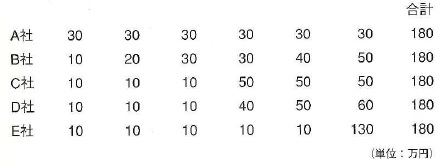 社員一人の月給の平均を求めると、5社とも全て同じで、180/6=30(万円)になります。