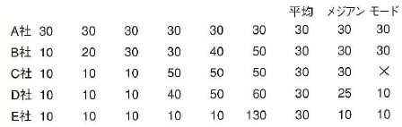 ただし、C社のモードが×なのは、最も多いデータが10と50の2つあるので決定できないからです。