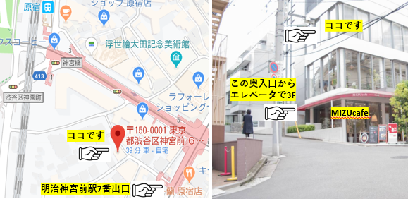 東京メトロ千代田線、副都心線 明治神宮前駅 7番出口すぐ 1Fの赤い屋根のカフェ(MIZUcafe)の3階です。